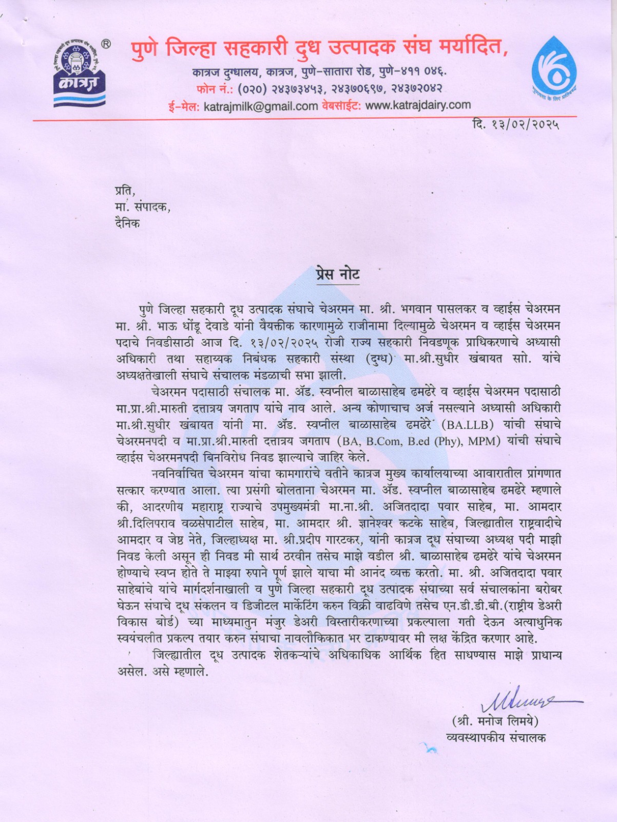 Praiinidhi : पुणे जिल्हा सहकारी दूध उत्पादक संघाचे चेअरमन मा. श्री. भगवान पासलकर व व्हाईस चेअरमन मा. श्री. भाऊ धोंडू देवाडे यांनी वैयक्तीक कारणामुळे राजीनामा दिल्यामुळे चेअरमन व व्हाईस चेअरमन पदाचे निवडीसाठी आज दि. १३/०२/२०२५ रोजी राज्य सहकारी निवडणूक प्राधिकरणाचे अध्यासी अधिकारी तथा सहाय्यक निबंधक सहकारी संस्था (दुग्ध) मा.श्री. सुधीर खंबायत साो. यांचे अध्यक्षतेखाली संघाचे संचालक मंडळाची सभा झाली.